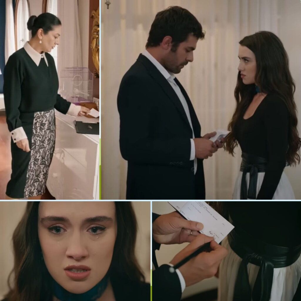 Nazajutrz Tulay przekracza próg sypialni Zeynep i Halila. Pomieszczenie jest puste, w powietrzu unosi się zapach świeżego mydła i wilgoci po kąpieli. Kobieta zamierza już wycofać się, gdy nagle jej wzrok zatrzymuje się na czymś drobnym, połyskującym na dywanie. Podchodzi bliżej i schyla się, by podnieść kartkę. Serce zaczyna jej bić mocniej. To nie zwykły skrawek papieru – to czek in blanco, opatrzony wyraźnym podpisem Halila.